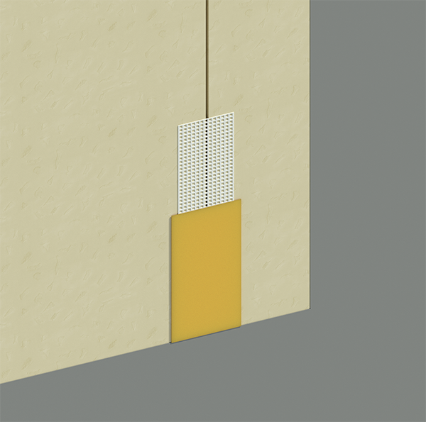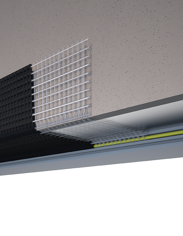 Las áreas perimetrales de ventanas reciben un refuerzo especial mediante malla fijada mecánicamente al perfil de aluminio y anclada a la pared, garantizando mayor estanqueidad en puntos críticos.