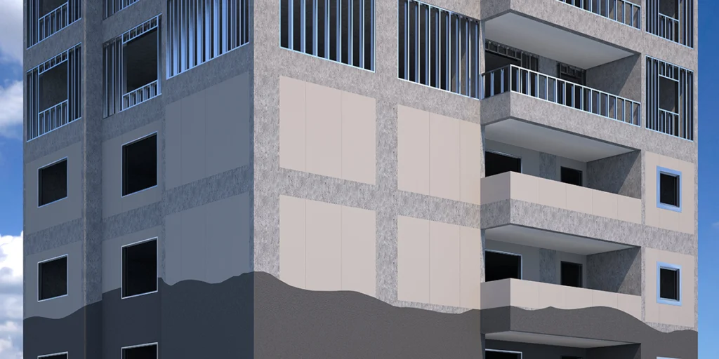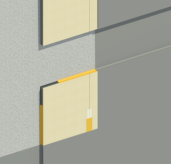 En las intersecciones entre hormigón y estructura metálica del Steel Frame, se aplica masa acrílica reforzada con malla, compensando los diferentes movimientos entre los materiales y evitando fisuras.